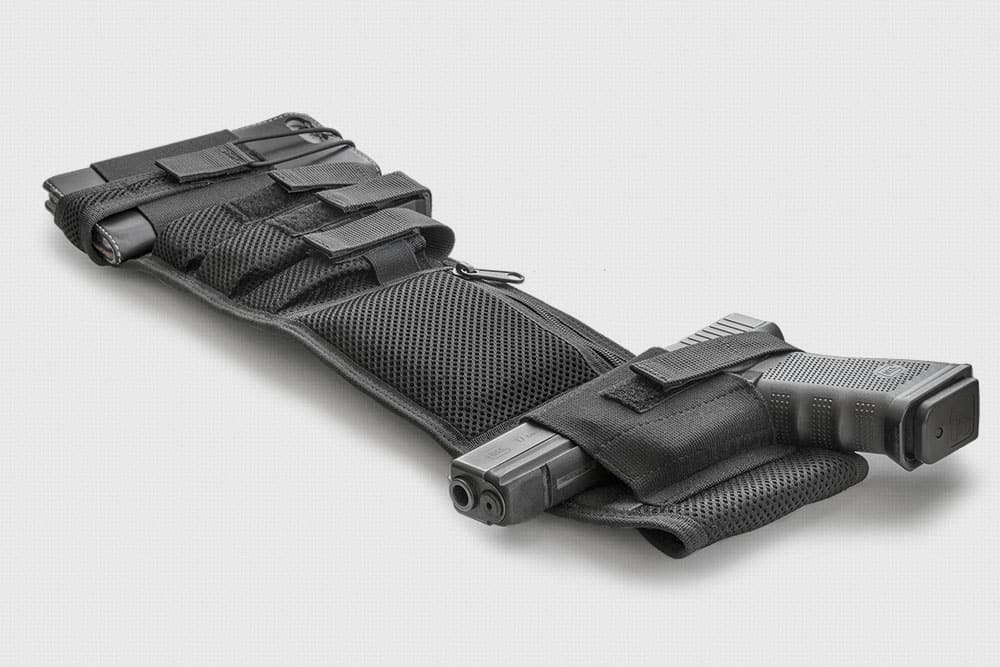A phone/radio pocket features a secure flap. A document pocket is water-resistant. Pockets for the firearm and spare magazines come with adjustable flaps to fit different models and are designed to prevent accidental cartridge loss and stop undersized gear from slipping inside.
