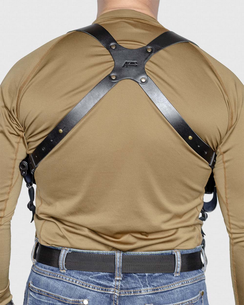 Материал: кобура — трехслойный термосендвич (кожа+термопласт+замша), плечевые лямки — кожа