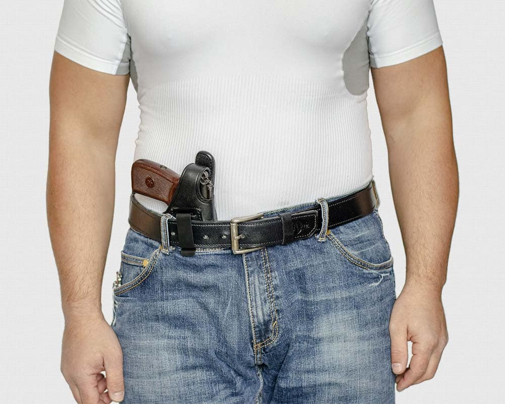 Назначение кобуры — ношение пистолета на поясе и внутрибрючно. купить скрытую кобуру пм к9 a-line Baikal МР-654К