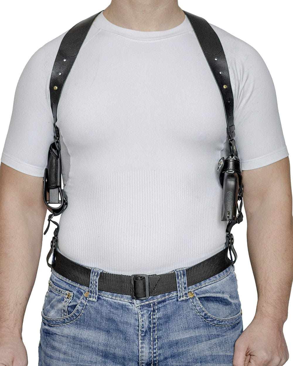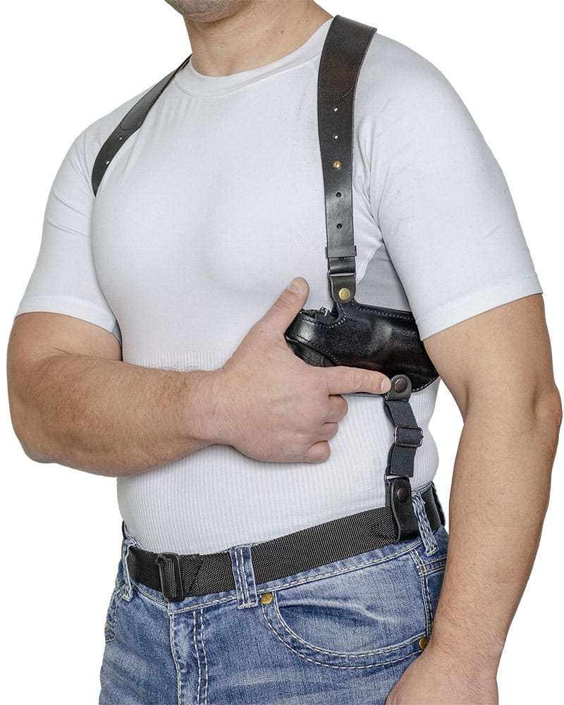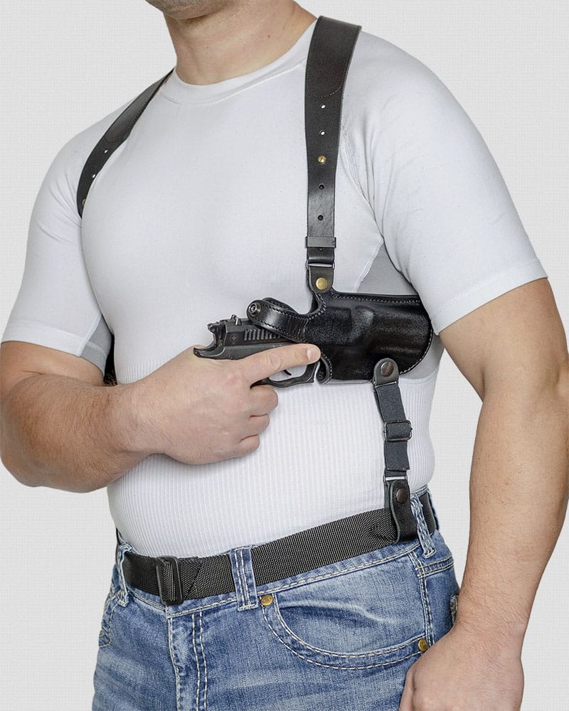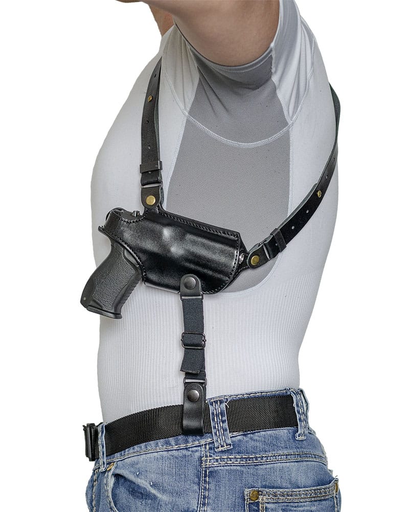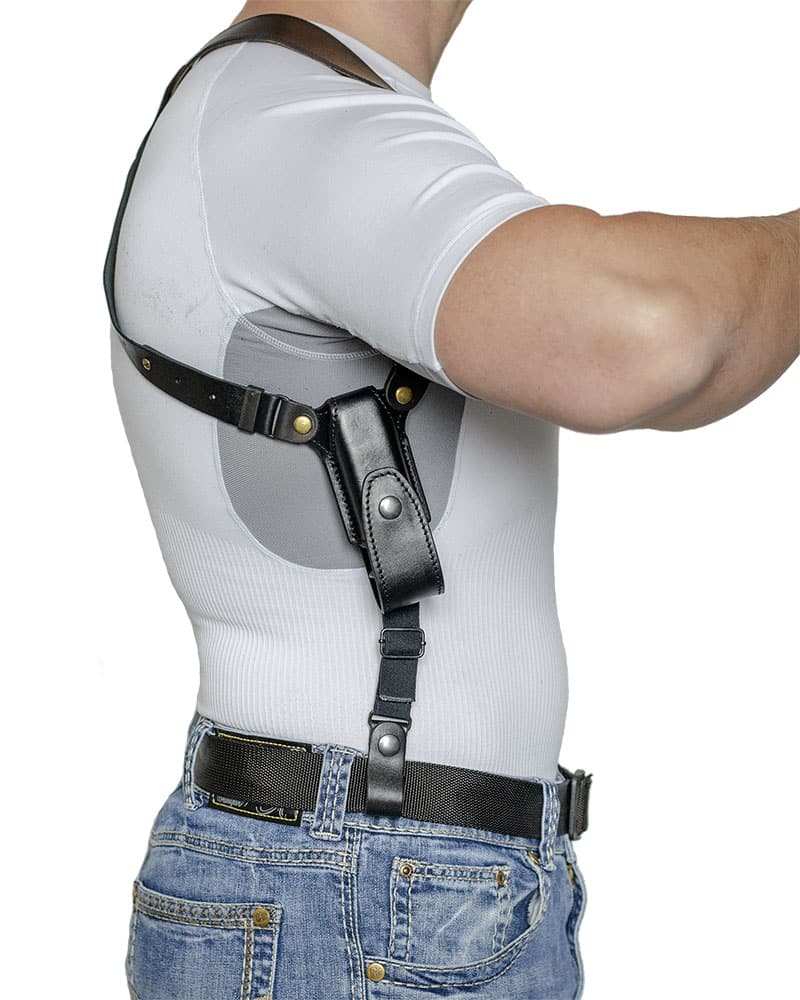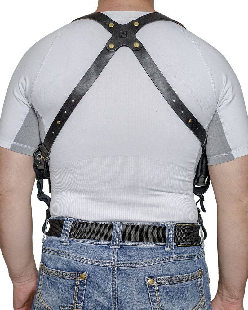 Материал: кобура — трехслойный термосендвич (кожа+термопласт+замша), плечевые лямки — кожа