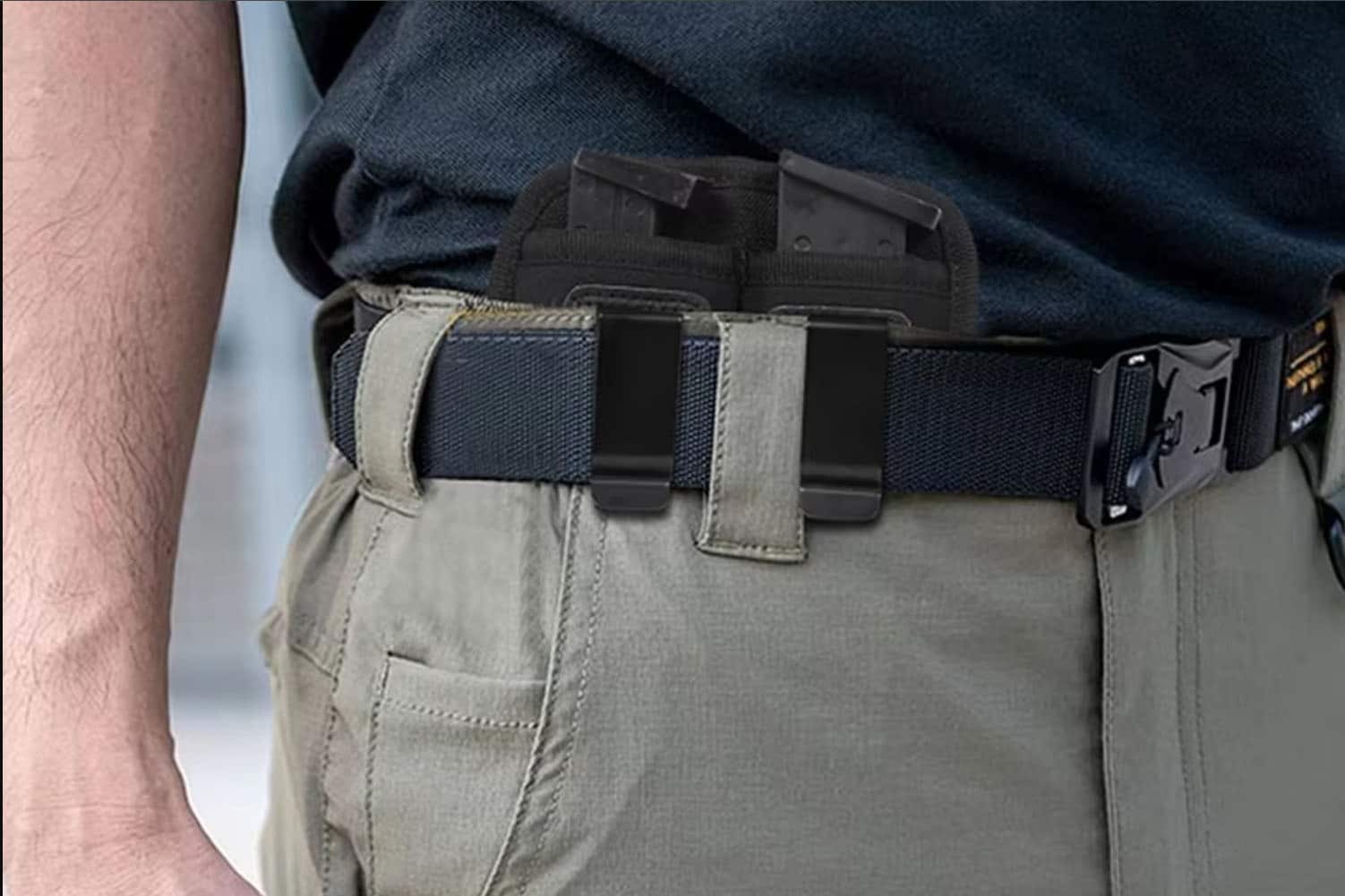 Внутрибрючный подсумок для двух магазинов открытого типа. Изготовлен из плотного нейлона. Для фиксации на поясе имеет металлическую, на ремень шириной не более 45 мм. Подсумок подходит для большинства пистолетных магазинов, таких как Форт-20, Colt 1911, Glock, Flarm T910/TQ1, SIG, Beretta, CZ P-10, HK.