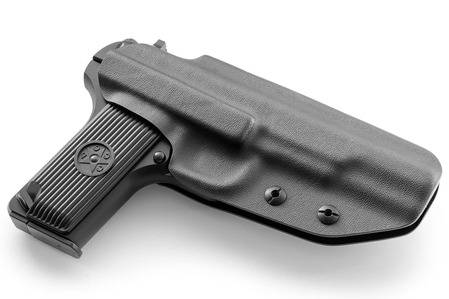 Кобура для скрытой переноски пистолета внутрибрючно, для левши. Надежное удержание пистолета в кобуре возможно благодаря фиксации пластика в определённых углублениях пистолета, при этом извлечение пистолета возможно за счет гибкости материала кобуры. Кобура формована для пистолета ТТ (Тульский Токарев).