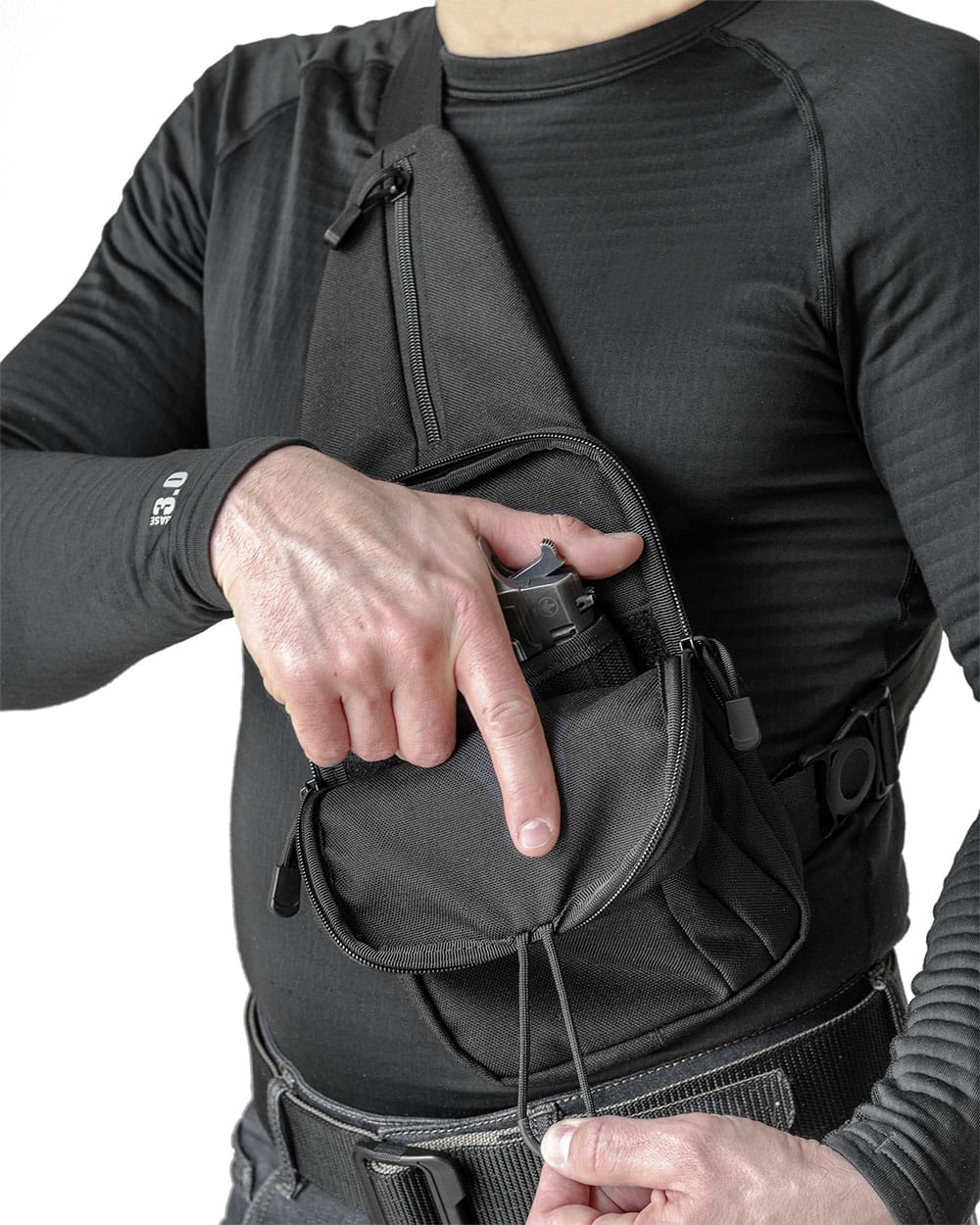 Нагрудная сумка-кобура разработана в первую очередь для убежденных сторонников комплексного подхода к вопросам личной безопасности. Главное отличие от обычной сумки – система экстренного доступа к оружию. Сумка состоит из нескольких отделений позволяющих размещать короткоствольное оружие и магазины к нему, средства самозащиты, электронные приборы с диагональю экрана до 4”, ключи, а также документы. Оружие и средства самозащиты располагаются в отделении, вплотную прилегающем к телу владельца, в универсальном вкладыше оригинальной конструкции, который позволяет разместить среднеразмерные модели пистолетов. Сумку удобно носить на груди или с переводом за спину – и одним быстрым движением менять её положение в зависимости от ситуации, при этом сохраняется возможность быстрого доступа к оружию. При скоростных перемещениях сумка не сковывает движений пользователя. Изготавливаются варианты ношения для левши и для правши.
