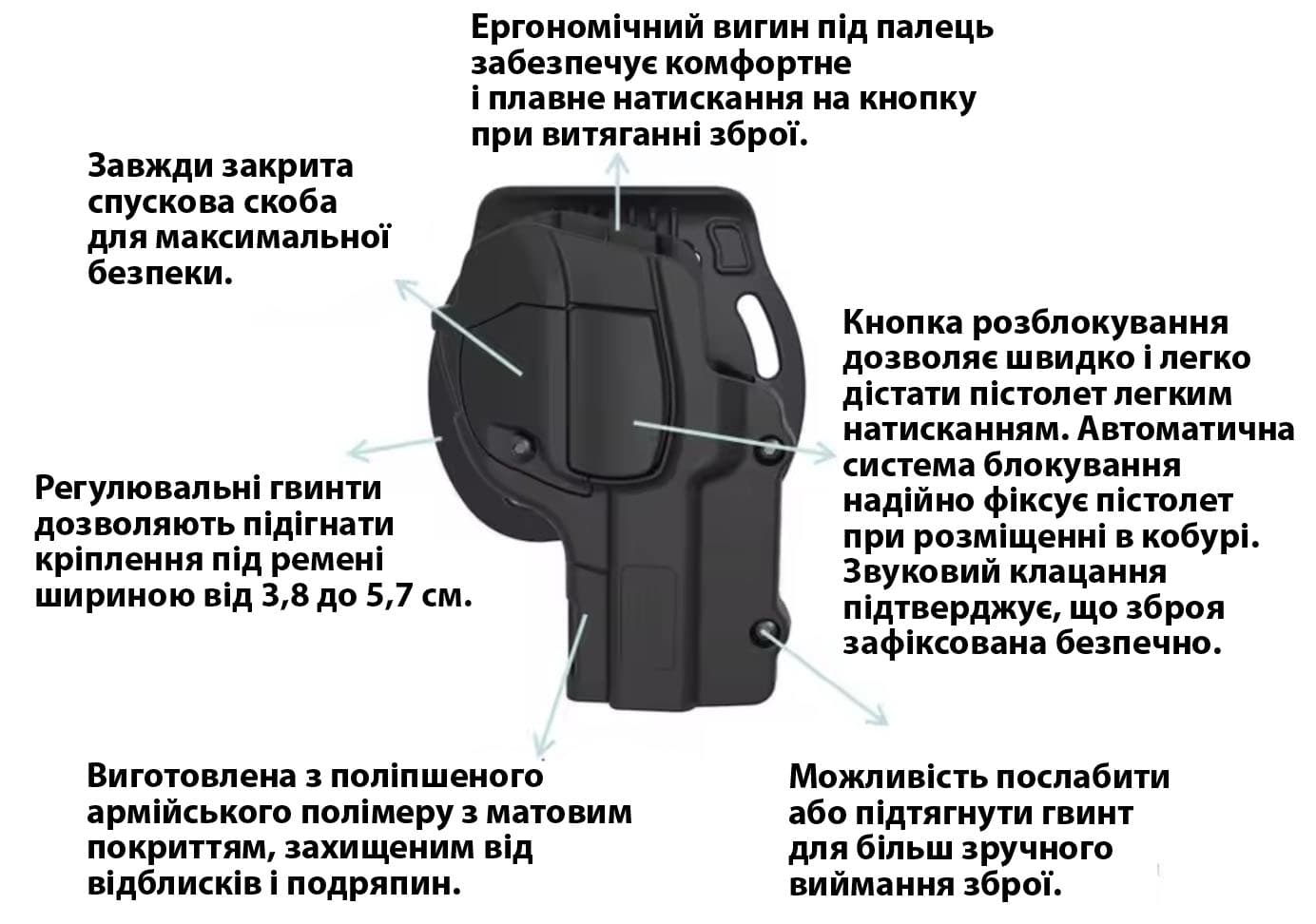 - автоматична блокування гарантує безпеку зброї після розміщення в кобуру;