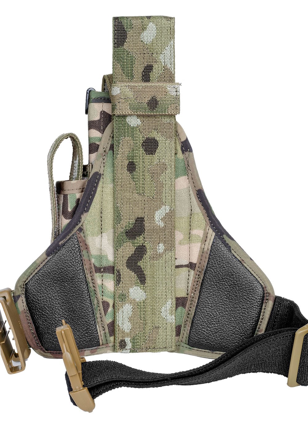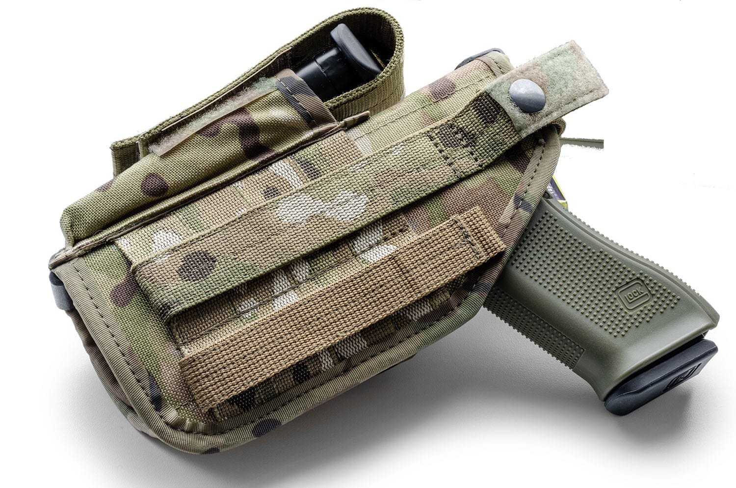 Основа конструкції кобури – жорсткий “хребет”, що дозволяє прогнозовано розмістити її в зоні осі шийки стегна. Саме в цьому місці забезпечується одноманітність розташування зброї, навіть при інтенсивних прискореннях та подоланні перешкод. Не ковзаючі вставки, розташовані внизу платформи – виключають мимовільне переміщення кобури стегною. Настегна кобура адаптується під будь-яку модель пістолета або пістолета з підствольним модулем проводиться самим користувачем. При цьому забезпечується простота та надійність подальшого використання. Кобура знімна, кріпиться на систему MOLLE.