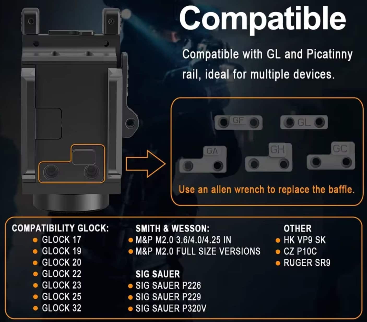 Підходить для пістолетів з планкою Picatinny: Glock 17/19/20/21/22/23/25/31/32 і аналогічні, M&P M2.0 (3.6/4.0/4.25″), SIG Sauer P226/P229/P320, HK VP9 SK, CZ P10C, багато моделей Taurus (G2C, THc, TS9 та ін.), а також карабіни з планкою Picatinny.Легкий і компактний