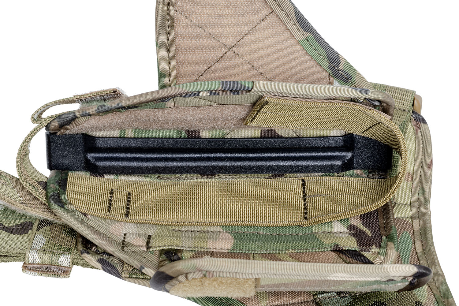 Кобура універсальна, MOLLE сумісна, призначена для розміщення на грудній панелі бронежилета. Розміщення пістолета у верхній частині грудної панелі бронежилета дає змогу краще контролювати збереження і чистоту зброї, мати до неї кращий доступ в умовах обмеженого простору. Пластикова направляюча надійно захищає внутрішню частину кобури від контакту з гострими краями прицільних пристосувань, а прицільні пристосування від “зализування” їх до блиску кобурою. Просте і технологічне рішення забезпечує надійну страховку від не запланованого відкривання. Адаптація під будь-яку модель пістолета або пістолета з підствольним модулем проводиться самим користувачем. При цьому забезпечується швидкість, простота і надійність подальшого використання.універсальна горизонтальна кобура моллє molle