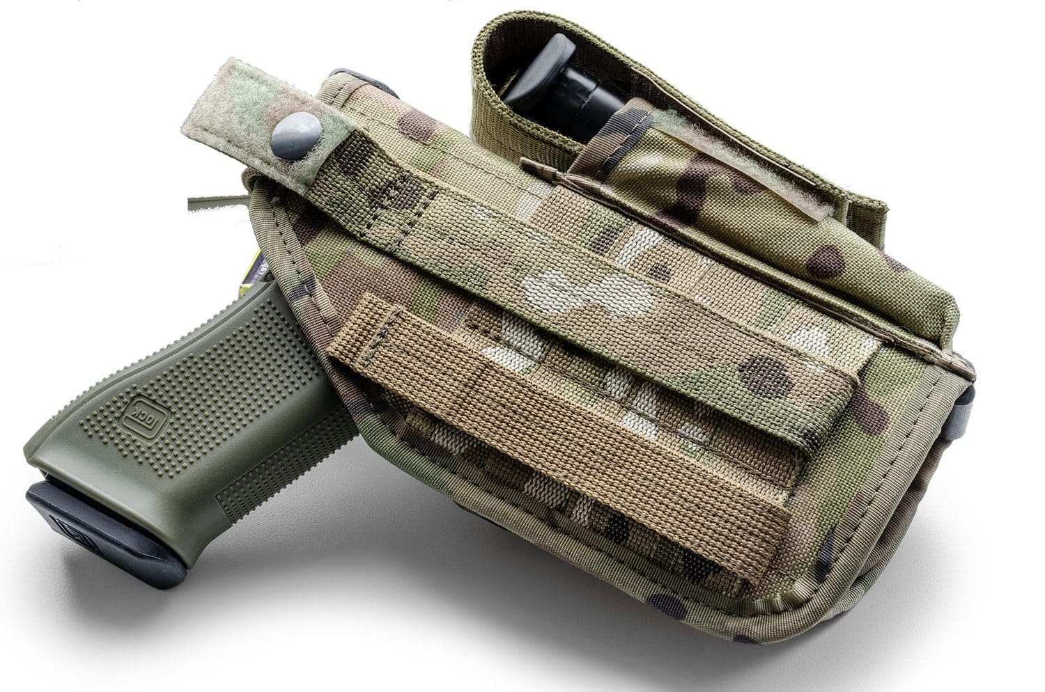 Универсальная, MOLLE совместимая кобура позволяет выбирать пользователю зоны ее размещения на поясе, бронежилете или набедренной платформе. Пластиковая направляющая надежно защищает внутреннюю часть кобуры от контакта с острыми кромками прицельных приспособлений, а прицельные приспособления от «зализывания» их до блеска кобурой. Простое и технологичное решение обеспечивает надежную страховку от не запланированного открывания. Адаптация под любую модель пистолета или пистолета с подствольным модулем проводится самим пользователем. При этом обеспечивается быстрота, простота и надежность последующего использования. В торцевой части кобуры находится подсумок для дополнительного магазина или мультитула. Защитный клапан подсумка регулируется по длине. Кобура для левши.
