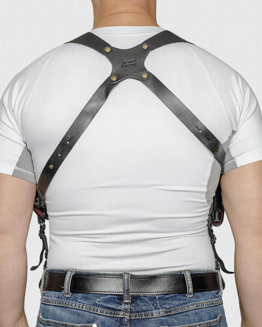Материал: кобура — трехслойный термосендвич (кожа+термопласт+замша), плечевые лямки — кожа