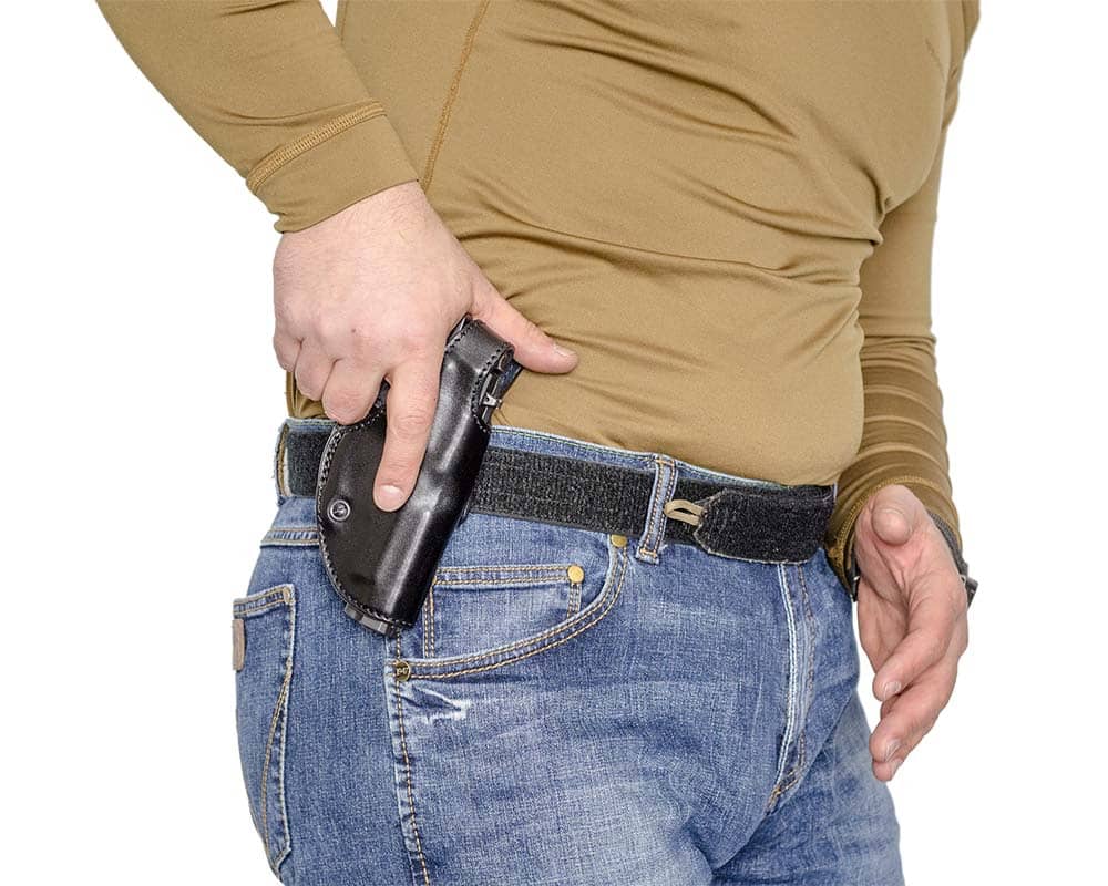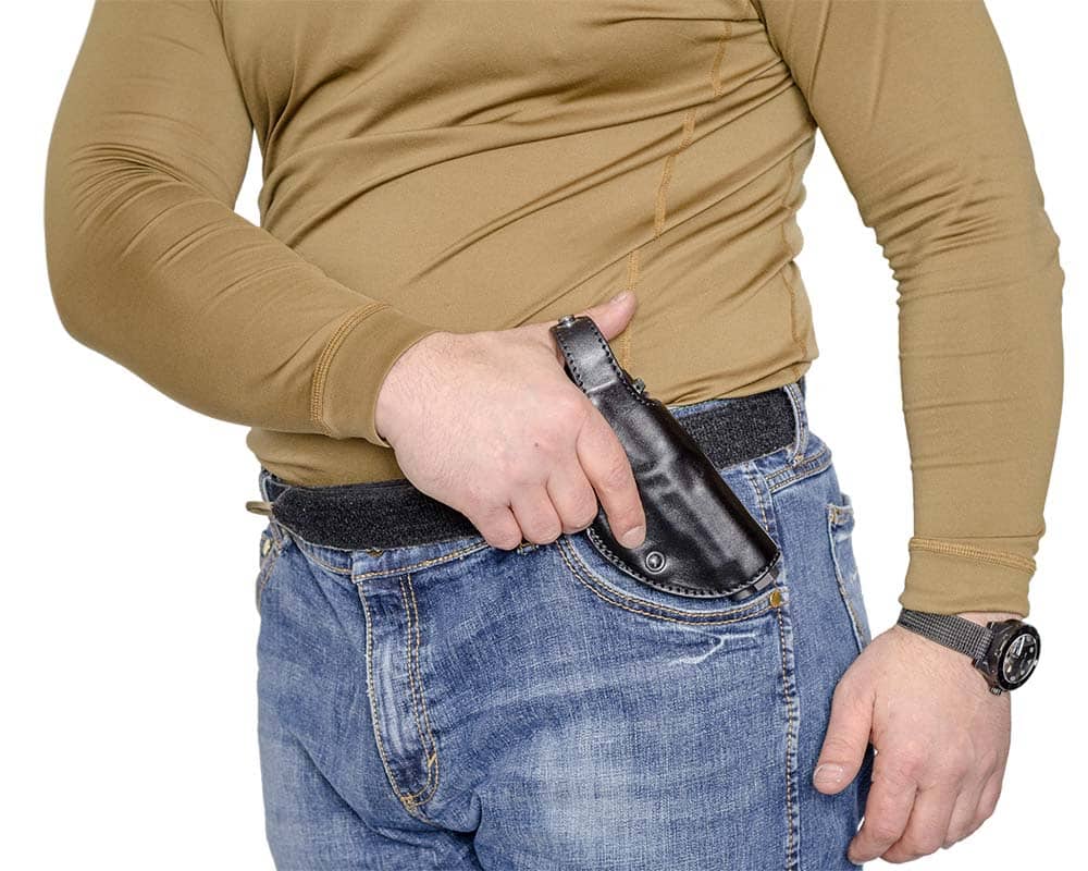 - ношение на брючном ремне шириной до 4 см со стороны рабочей руки и для перекрестного выхватывания;