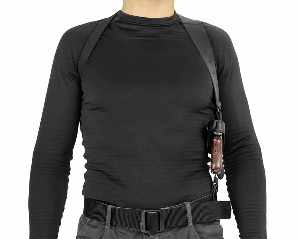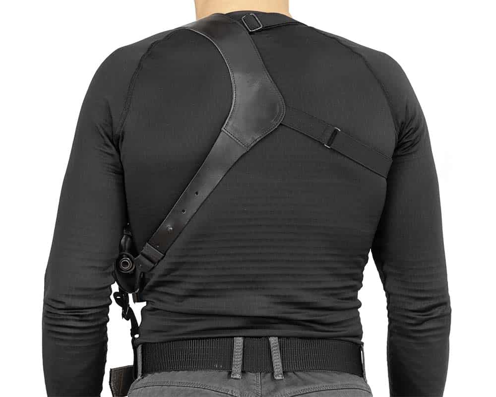 Материал: кобура — кожа+термопласт+замша (трехслойный термосендвич), плечевая лямка — кожа
